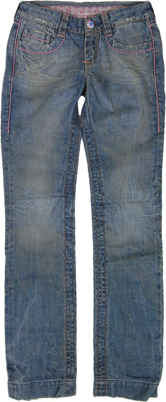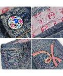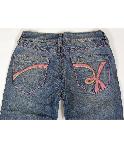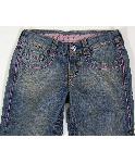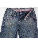 ピンクのステッチと、ロゴをあしらったヒップポケットの刺繍がかわいいデニムです。石入りのフロントボタンが目を惹きます。イタリア製です。