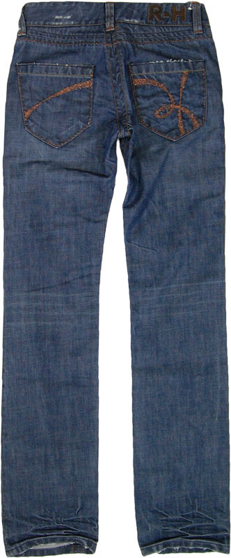 ステッチと、ロゴをあしらった刺繍が入ったヒップポケットのリハッシュ定番のデニムです。刺繍糸に金属のような糸を使っていますので、キラキラしています。RHのラベルはハラコ素材です。石入りのフロントボタンが目を惹きます。イタリア製です。