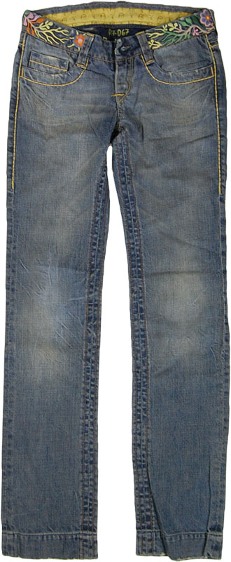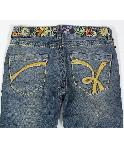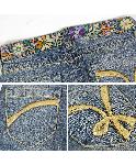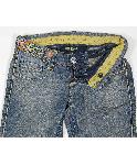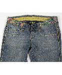リハッシュの真骨頂ともいえる刺繍が入ったデニムです。ウエスト周りに花柄の刺繍が入っています。もちろんリハッシュの特徴的な、太めのステッチ、ヒップポケットのロゴステッチも入っています。石入りのフロントボタンは、ボタンホールが小さくてボタンが通りませんので、お手持ちのボタンと付け替えて頂くか、ボタンホールを大きくしてください。