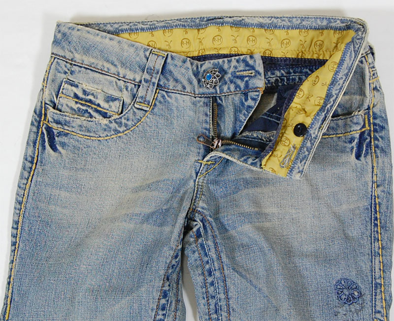 リハッシュのクロップドデニムです。リハッシュならではのヒップポケットのロゴ刺繍や太めのステッチはもちろん、花柄の刺繍が入っている凝ったデザインです。ボタンもアンティーク調になっています。イタリア製です。