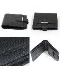 型押しレザーの2折財布です。ベルトと金具がアクセントになっています。