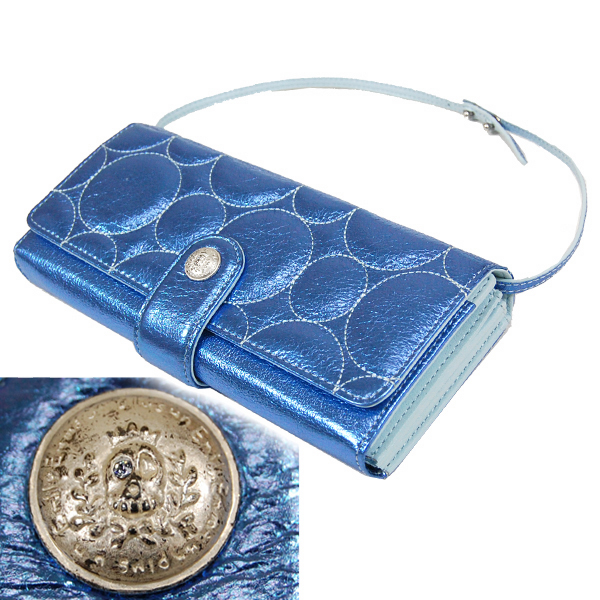 un plus unのお洒落なブルーの長財布です。ドクロマークの入ったお洒落な財布です。片目がキラリとひかりポイントです。 持ち手もついており、取り外しが出来ます。 カード収納たっぷりあり、使いやすい財布です。