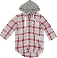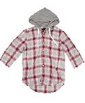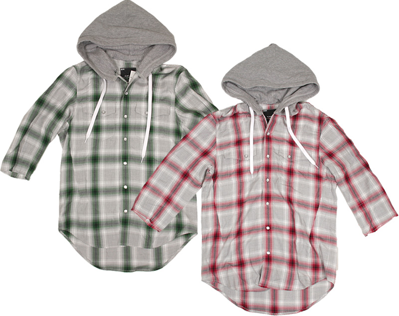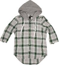 フード付きのチェック柄シャツです。7分袖、袖口は切りっぱなし。ボタンホックにウエスタンデザインの使いやすいシャツです。